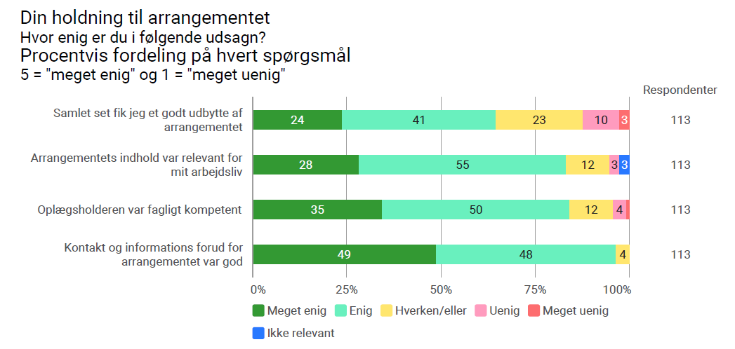 “Det er også vigtigt at nævne, at vi kun har evalueringer fra 113 deltagere, mens der var over 200 øvrige live-deltagere, som vi ikke har hørt fra – deres oplevelse kender vi derfor ikke. Generelt er det ofte de mere kritiske stemmer, der prioriterer at besvare evalueringer, så det er vigtigt at læse kommentarerne med dette for øje; de repræsenterer ikke nødvendigvis det samlede billede af deltageroplevelsen.“